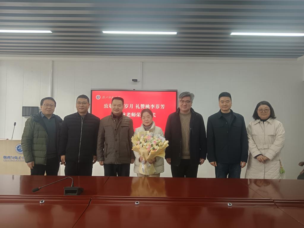 仪式中,学院向王明秋老师献上鲜花与纪念品,参会人员与王老师合影留念,共同定格这难忘的时刻。