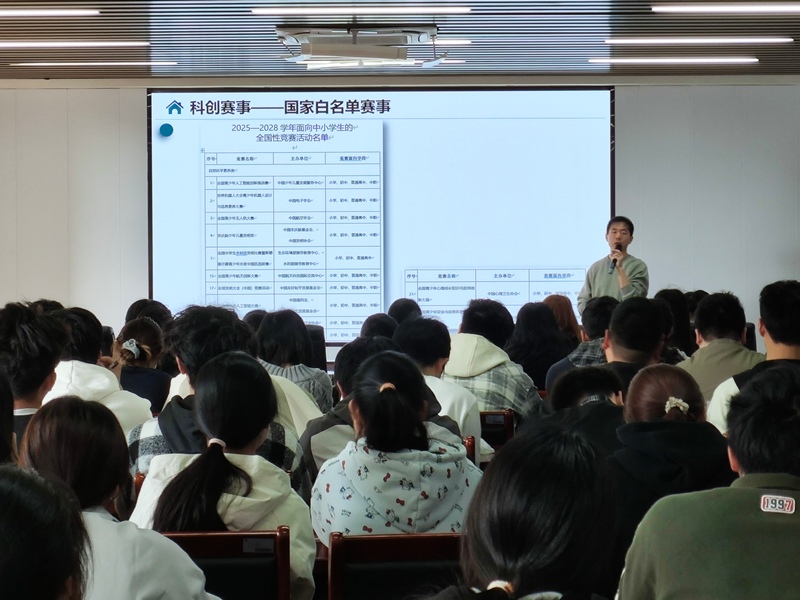 吴中鹏博士以《科创启蒙与实践:大学生如何用科创赋能中小学生、成就自己》为题,结合自身在实验教学中的改进经验,系统讲解了如何依托教材内容、融合跨学科知识开展教学创新,并分享了带队参加全国青少年科技创新大赛的实践心得,鼓励同学们勤于思考、主动实践,在科创教育中实现教学相长。